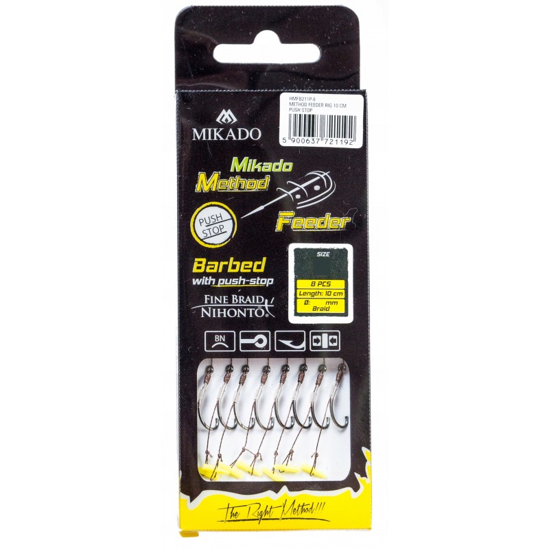 Profesjonalnie wykonane przypony z włosem zakończonym stoperem push stop, quickstop do szybkiego mocowania przynęt firmy Mikado zawiązane na wyjątkowo miękkiej i mocnej plecionce Nihonto Fine Braid w maskującym brązowym kolorze długości 10cm.