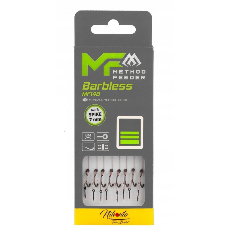Gotowe przypony do Method Feeder, uwiązane na wzmocnionych i niezwykle ostrych, bezzadziorowych hakach MF14. Gwarantują pewne trzymanie nawet największych okazów. Zakończone igłą. Wersja na plecionce.