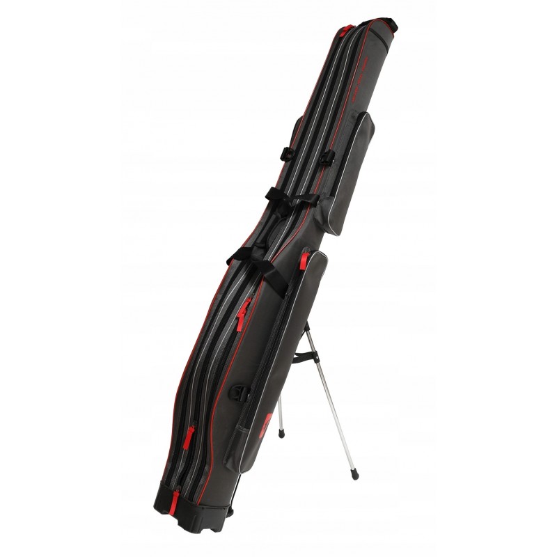 Profesjonalny, niezwykle wytrzymały usztywniany pokrowiec wędkarski z 3 pojemnymi komorami na komplety wędek i kołowrotków. Wyposażony w nowoczesny system nóżek, umożliwiających wygodne korzystanie z pokrowca w pozycji stojącej.