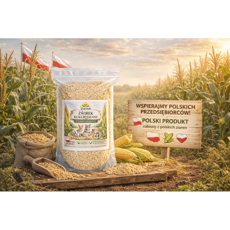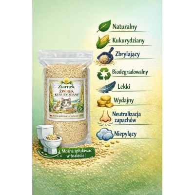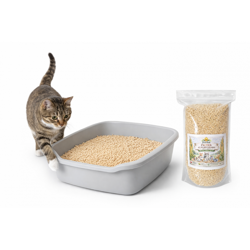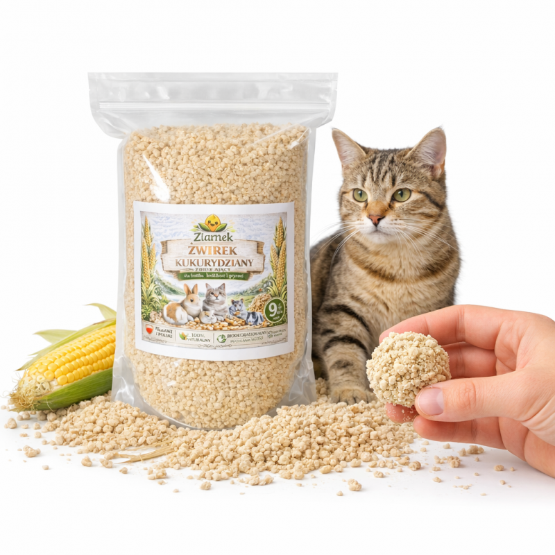 Produkt powstał w 100% z kukurydzy. Ze względu na naturalne różnice między partiami surowca możliwe są niewielkie różnice w kolorze żwirku. To naturalne zjawisko, które potwierdza brak sztucznych dodatków i wypełniaczy.
